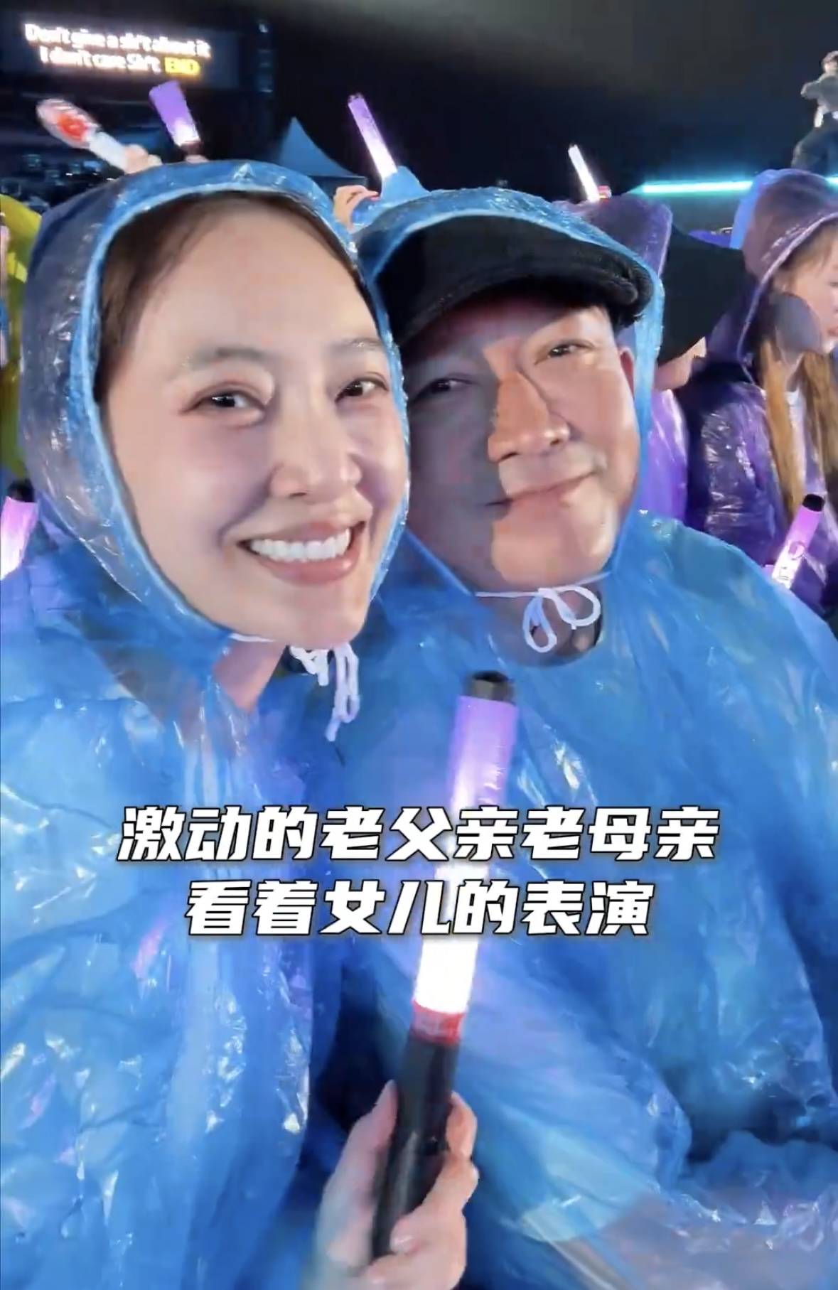 聂远夫妻在雨里观看女儿表演,好有爱。