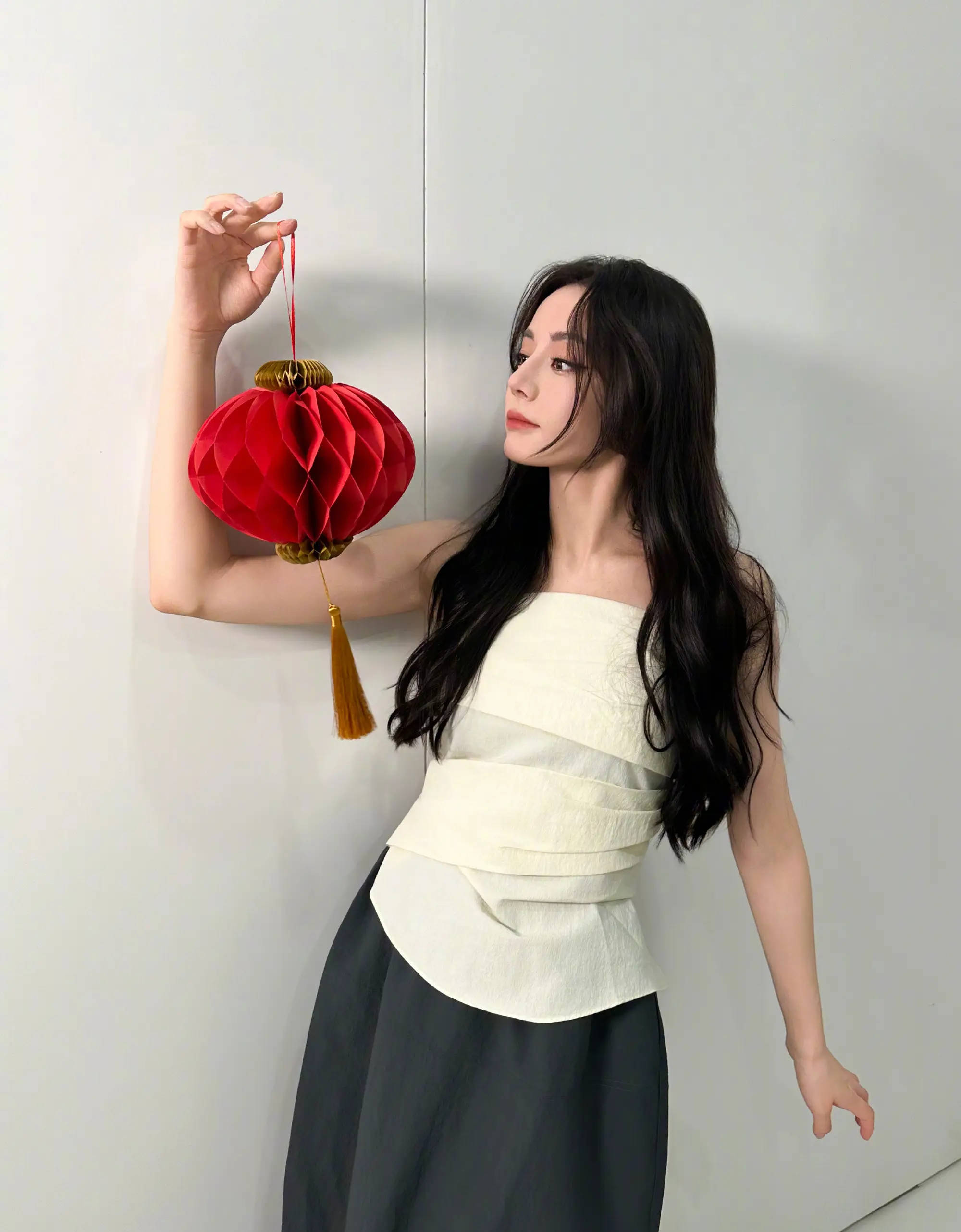 迪丽热巴手提红灯笼拍照,侧颜柔美迷人。