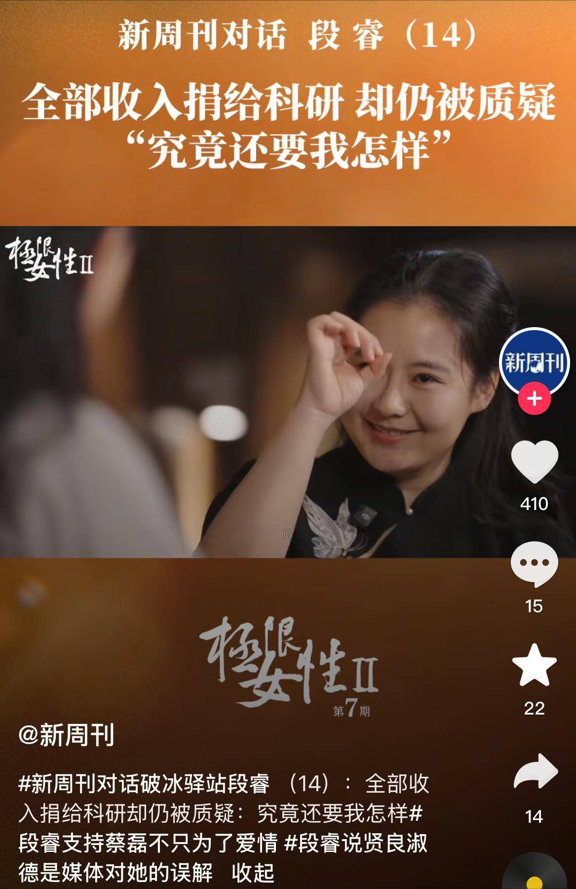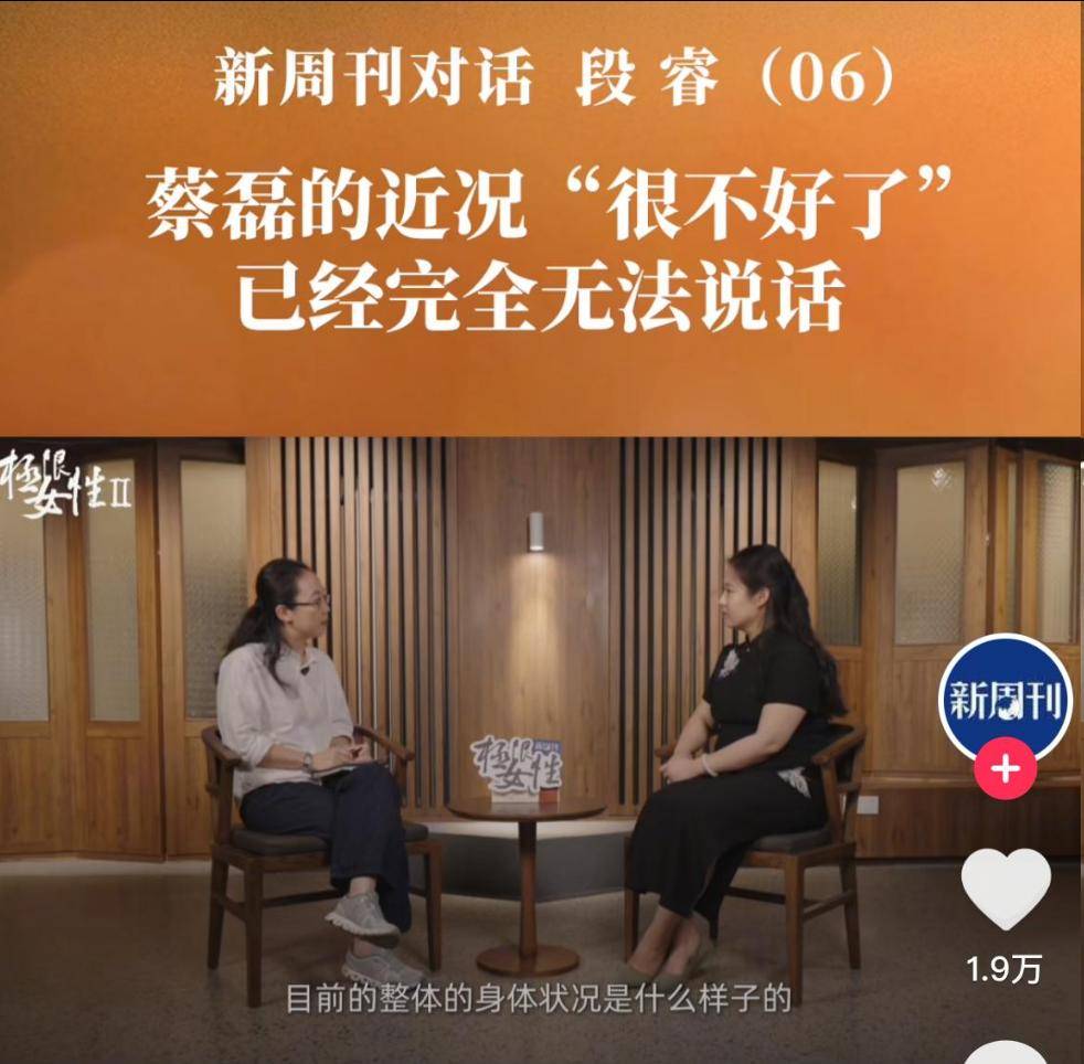 9月23日,新周刊晒出了与蔡磊妻子段睿的一段最新采访。