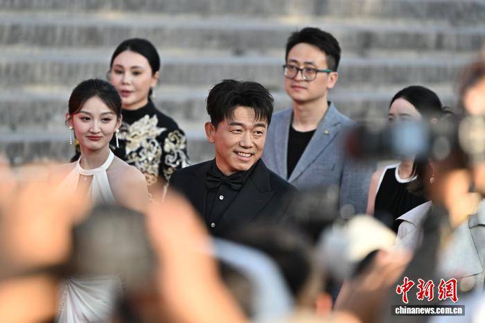 图为演员潘斌龙(中)携电影《西渡》主创人员亮相红毯。中新社记者 韦亮 摄