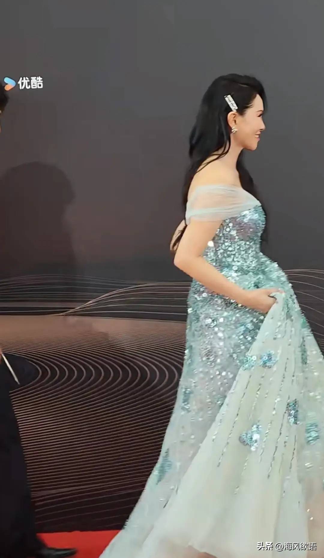 伊能静的造型真是让人有点意外,一身蓝色亮片礼裙配大波浪,看着是想走优雅路线,但那裙子款式老气,活脱脱早年的影楼风格。