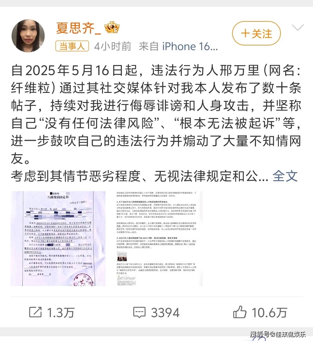 此前,纤维粒发文指控夏思齐出轨,但经过警方调查,证实纤维粒指控实则是造谣,不仅如此纤维粒公开支持网友攻击夏思齐母亲。