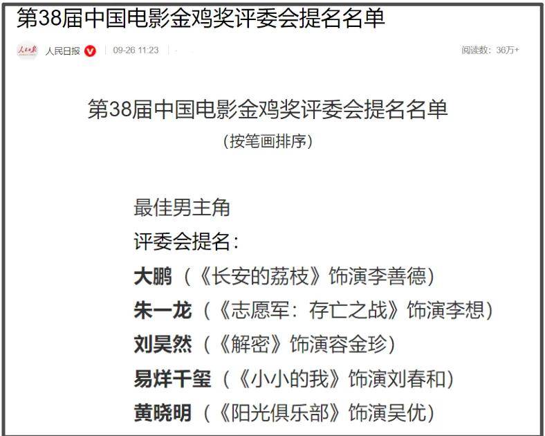 获得最佳男主角提名的有大鹏、朱一龙、刘昊然、易烊千玺、黄晓明。