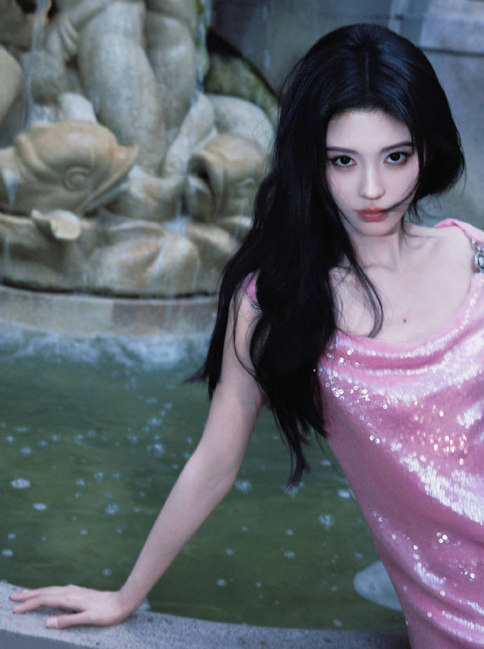 9月26日,鞠婧祎参加米兰时装周的造型曝出。图中,鞠婧祎穿粉色亮片吊带裙,秀发飘逸,坐在水边氛围感十足。