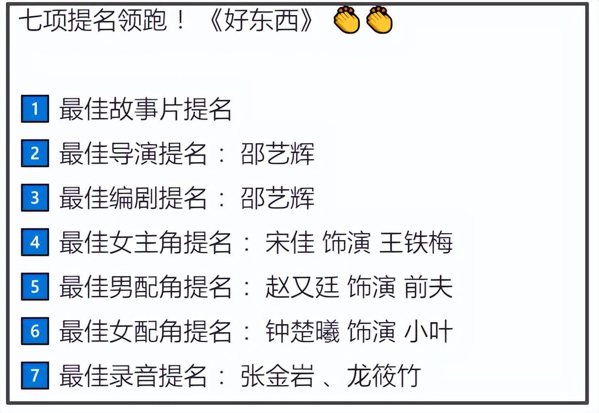而这次名单提名最多的电影是《好东西》,包括最佳导演、最佳编剧、最佳故事片和最佳女主角等获得七项提名,有望横扫本届金鸡奖。