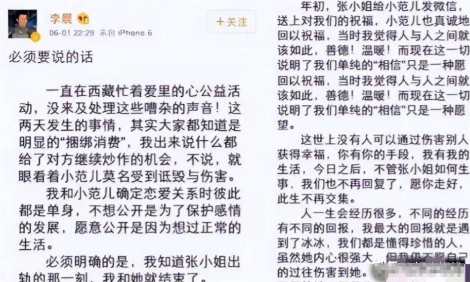 2018年,李晨官宣和张馨予分手后没多久,就迅速官宣新恋情,这本没有什么,可问题是他却在这个时候发了一篇长文,字里行间都是在暗示说张馨予在和他恋爱期间不专一,把自己包装成了深情男的人设。