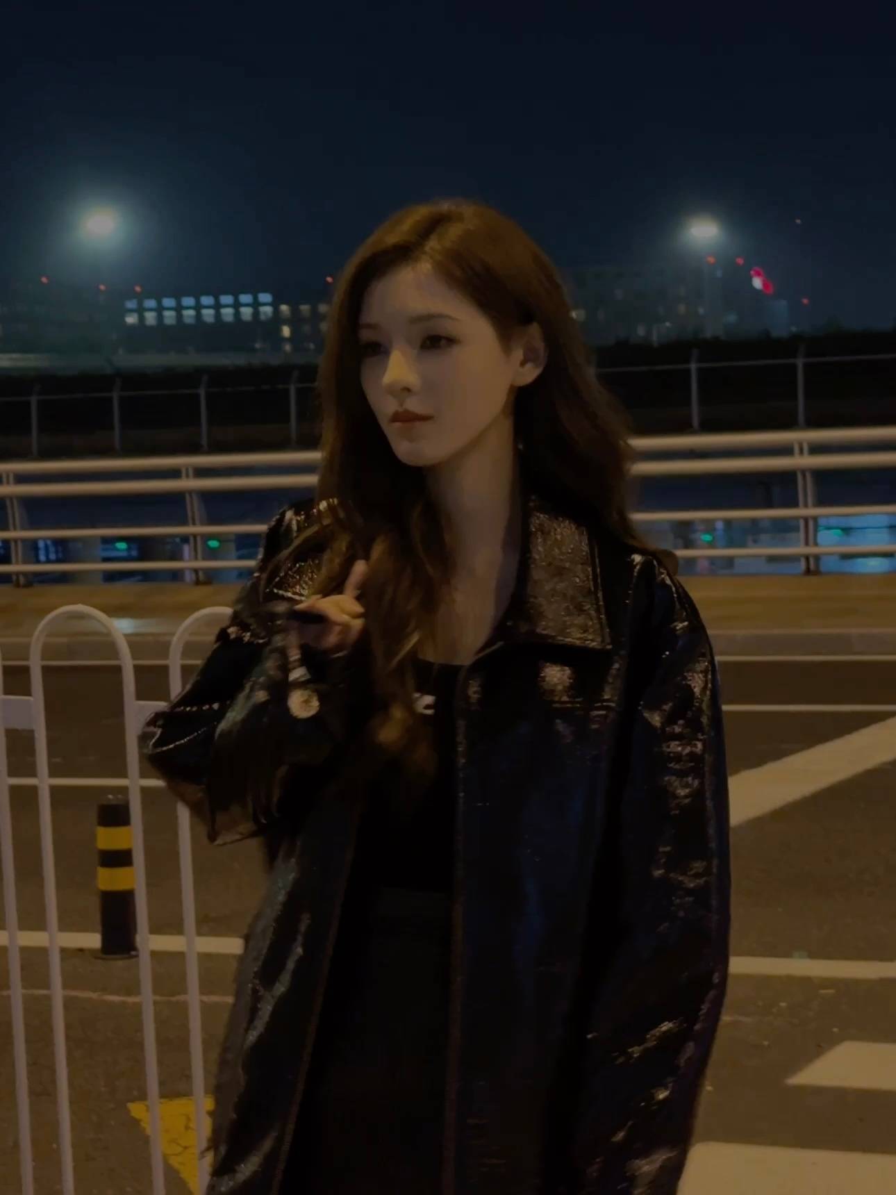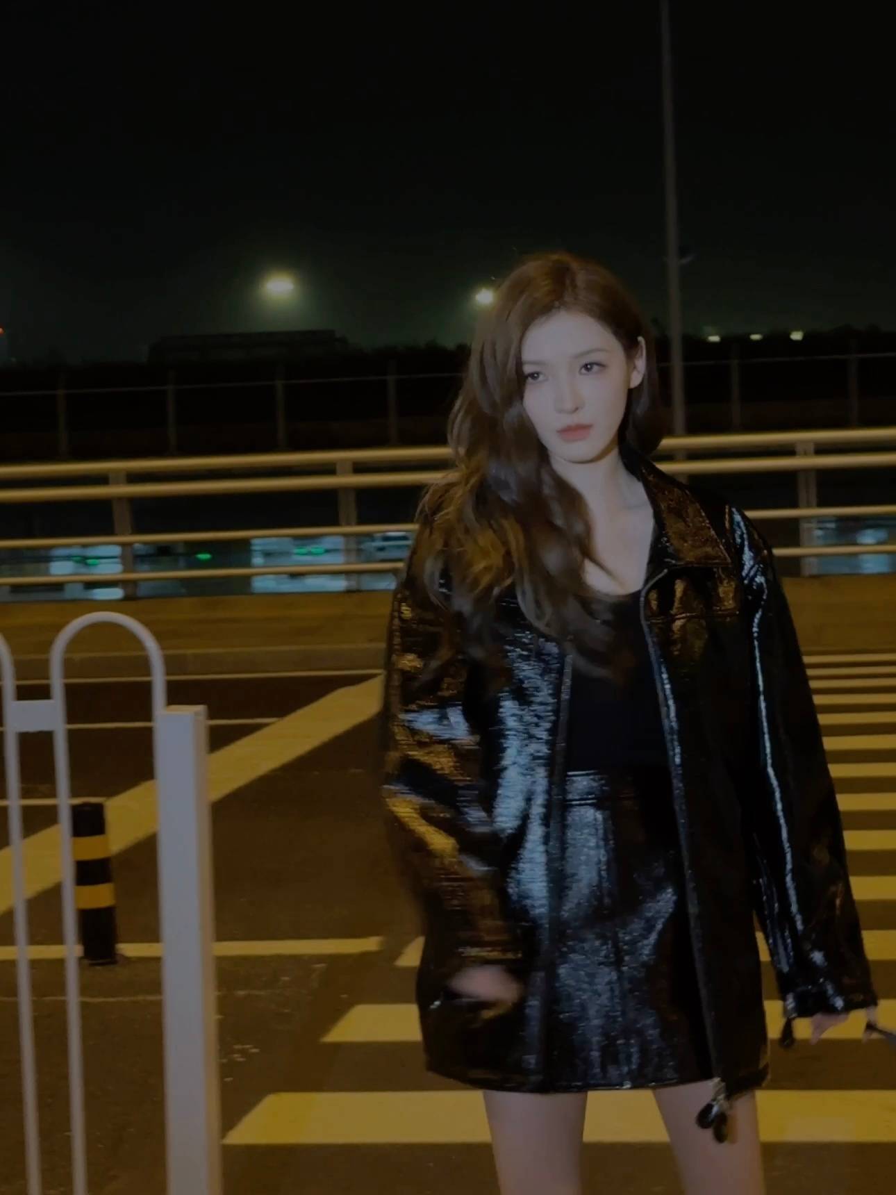 张予曦在夜色中回眸,眼神清冷,满是时尚氛围感。