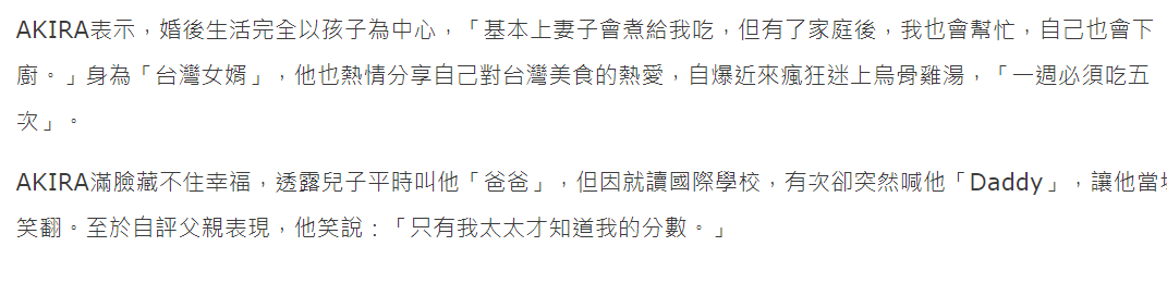 AKIRA婚后几乎不需要做家务活,全部由志玲姐姐承担,这一点跟韩国明星相似。