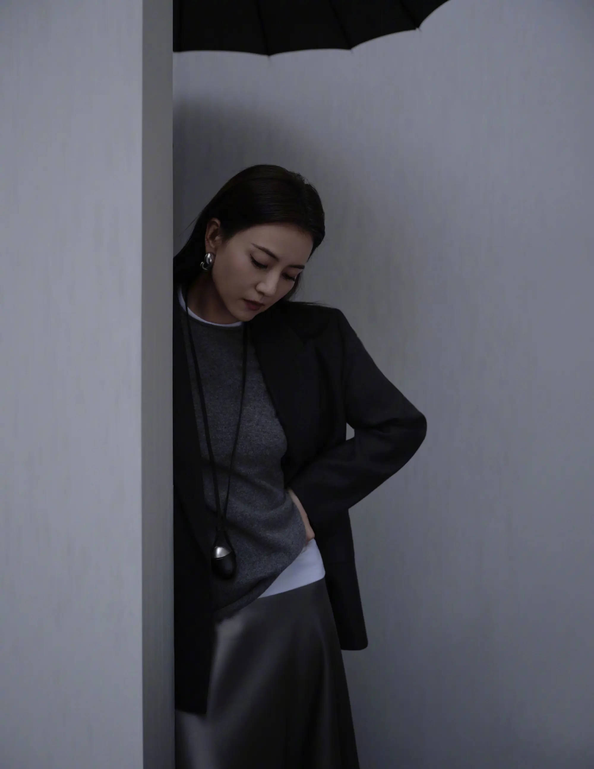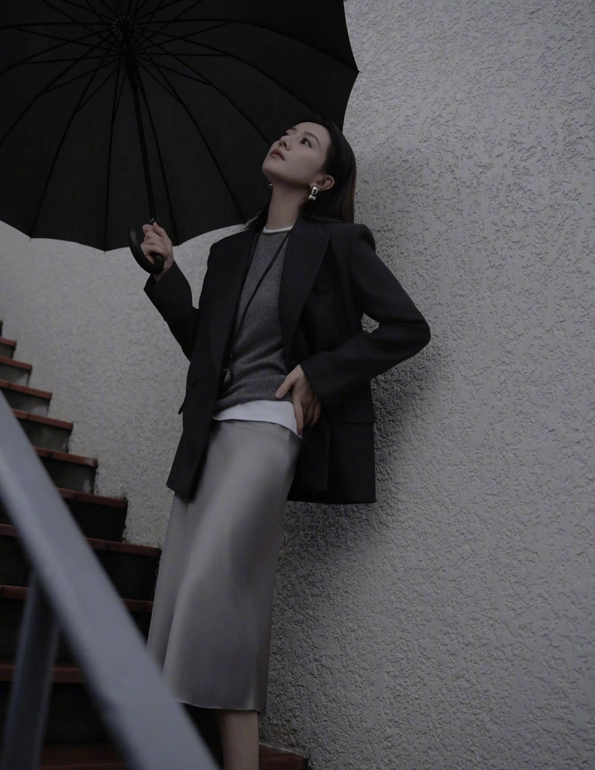 高圆圆站在大树旁拍照,穿西装外套搭配长裙,造型优雅迷人。
