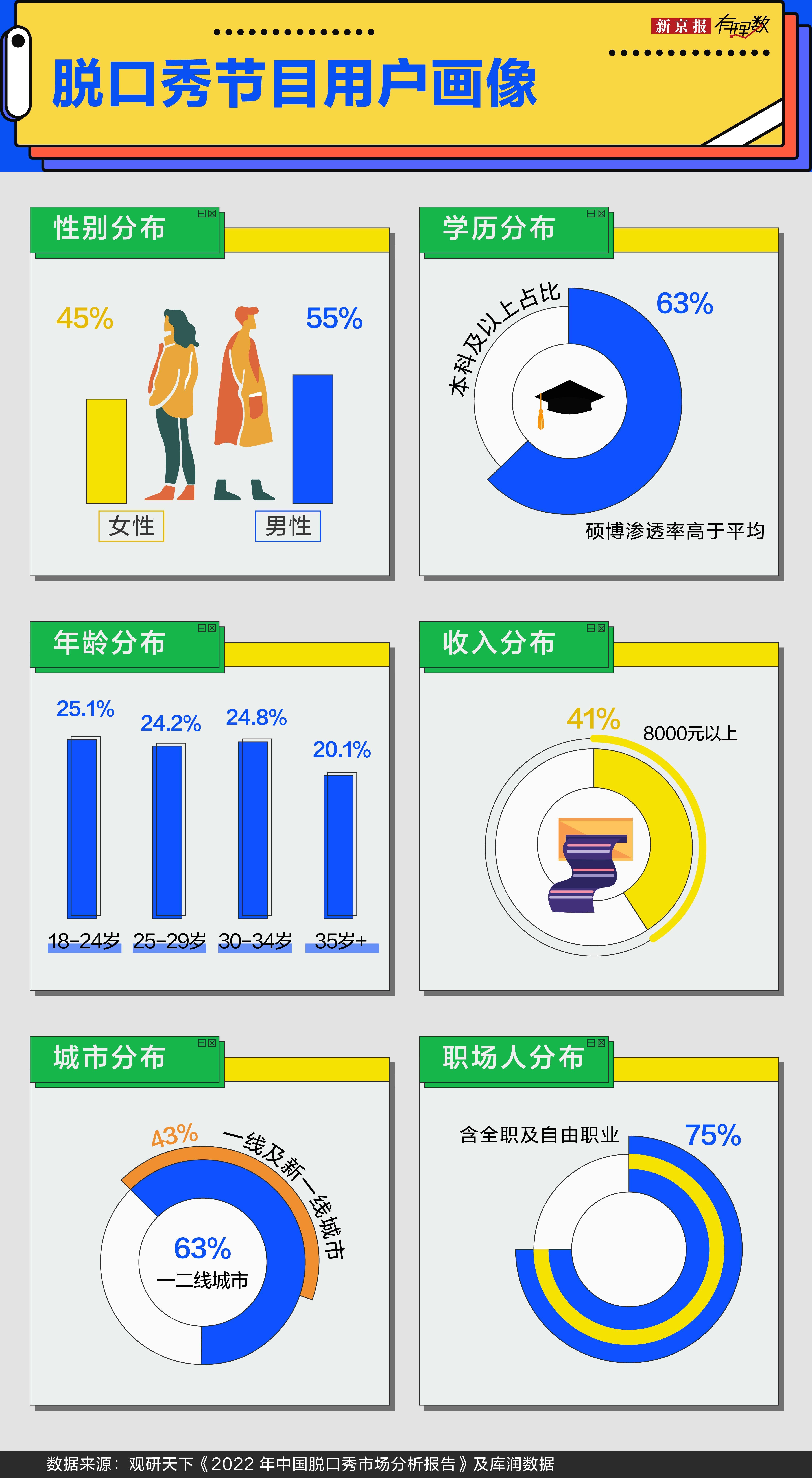 这样的形式和内容,决定了脱口秀的观众呈现出年轻化、都市化、高学历的特点。行业数据显示,在喜欢看脱口秀的用户里,18-34岁青年群体占比近75%,构成核心受众,一、二线城市人群占63%,高线级城市文化娱乐消费活跃,较高的文化水平也使他们更能理解和欣赏脱口秀中的语言技巧与思想内涵。