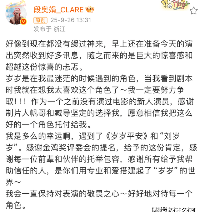 段奥娟本人对于自己提名金鸡奖也十分惊喜和意外,她发文称得知消息后一直没有缓过神来,既惊喜更忐忑,看来是对这份荣誉压力山大,作为一名新人演员,感谢导演组坚定地用她,也感谢金鸡奖评委会的肯定,未来也会好好对待每一个角色,一直保持对表演的敬畏之心。