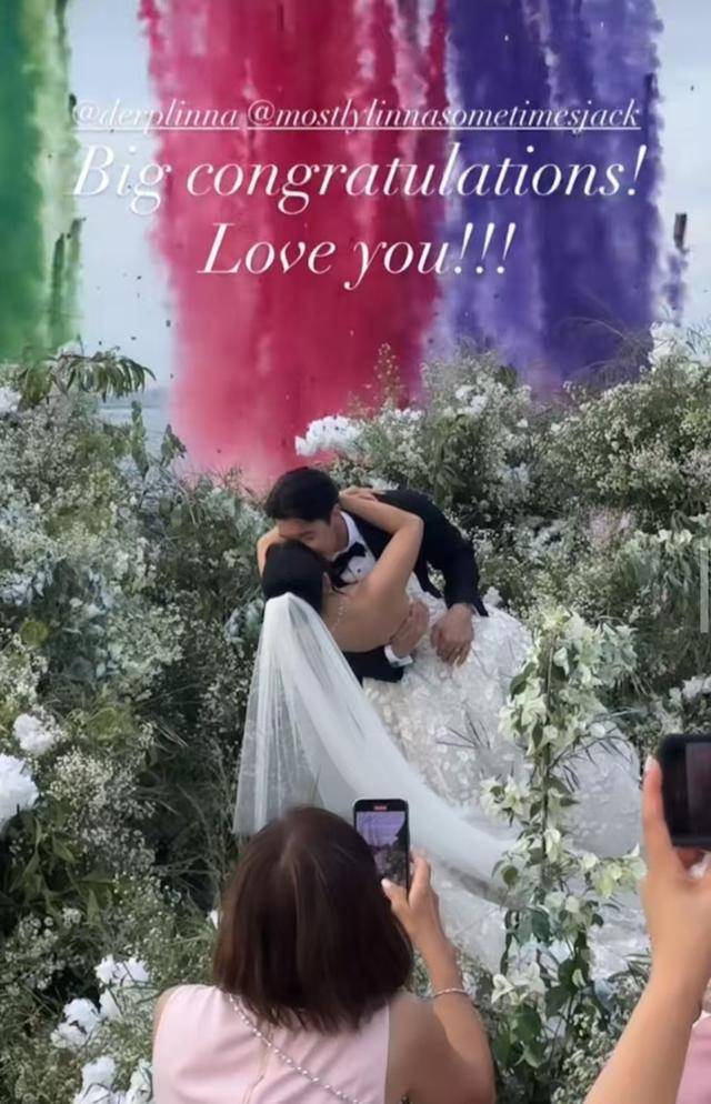 此外,林至昭还晒出了一段影片,影片中见到一对新人在布满鲜花的婚礼上甜蜜地拥吻,同时身后还出现了一大片彩色的烟花,画面可谓是非常唯美以及浪漫呀,在座的宾客们也都被这浪漫的氛围给包围着。