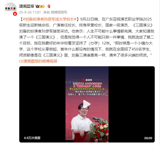 9月22日晚,在广东亚视演艺职业学院2025级新生迎新晚会后,广演首任校长、终身荣誉校长,国家一级演员,《三国演义》刘备的扮演者孙彦军接受采访。