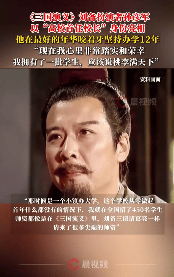 他表示:“人生不可能什么事情都完满,大家知道我演了一个《三国演义》,但是我觉得一个人不可能只做一件事情,我就选定了第二个目标,我在我最好的年华咬着牙坚持了(办学)12年。”“那时候是一个小镇办大学,这个学校从零做起,首年什么都没有的情况下,我就在全国招了450名学生,师资都像是在《三国演义》里,刘备三请诸葛亮一样,请来了很多尖端的师资。”
