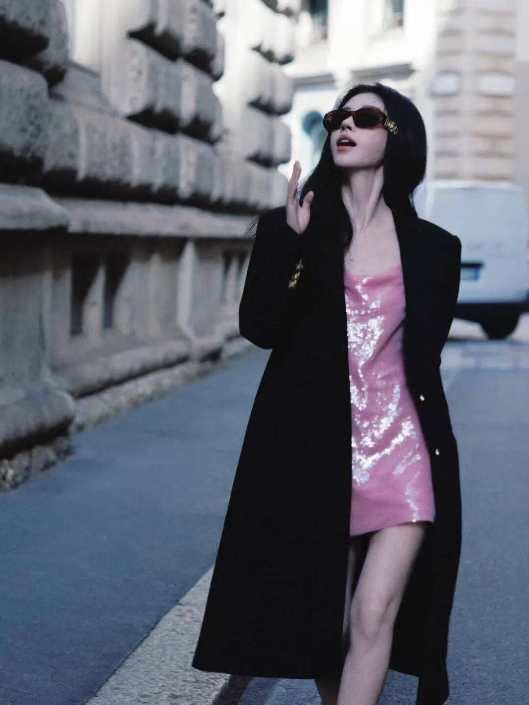 9月26日,著名女星鞠婧祎参加米兰时装周的造型曝出,魅力十足!图中,鞠婧祎穿粉色亮片吊带裙,她俏脸冷艳,浓眉大眼,烈焰红唇,乌黑的秀发如瀑布般飘逸,露出白皙的手臂,肌肤娇嫩如雪,这位美女坐在水边氛围感十足,既冷艳动人,又性感妩媚!