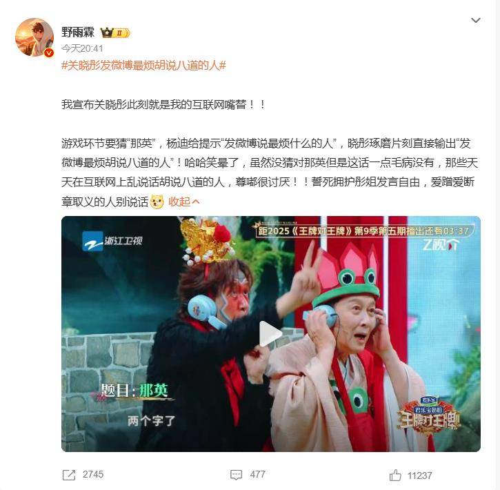 在最新一期的《王牌对王牌》中,一个猜词游戏意外贡献了本周最出圈的“金句”。当题目锁定艺人“那英”,主持人杨迪给出关键提示——“发微博说最烦什么的人”,本想引导嘉宾回忆那英著名的“最烦装逼的人”。谁知关晓彤略加思索,脱口而出:“发微博最烦胡说八道的人!”
