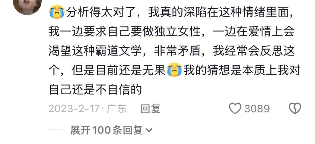 B站up主“香芹又青了”的解读被广泛认可:“很多时候,我们的自我认同和在爱情里的审美并不自洽。我们对人生的追求很当代,对爱情的审美却很过时。”这正是很多现代女性的困境——“自我认同”与“爱情审美”的割裂。