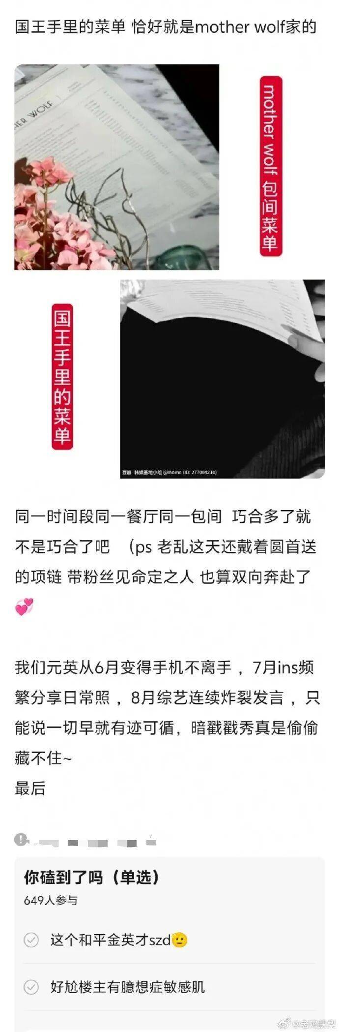 这波“恋情瓜”的核心,全藏在几张社交平台的晒图里。帖主首先指出,两人发布Ins照片的时间一前一后,且背景细节高度相似,疑似在同一家餐厅打卡。其次,照片中的大理石桌面纹路被拿来反复比对,成为“同桌吃饭”的关键物证。此外,两人曾分享过相同的小众冷门歌曲,也被视作“暗戳戳发糖”。更有网友深扒称,他们去的正是首尔某网红餐厅“Mother Wolf”,并搬出金泰亨队友金南俊晒出的菜单作为“旁证”——“套人”都去过,金泰亨怎么可能没去?
