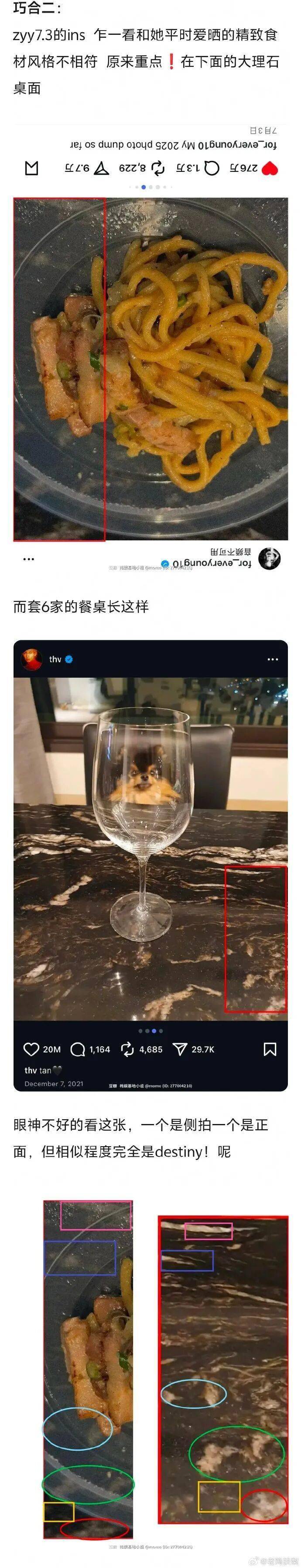 更硬核的打脸来自“大理石刑侦局”。多个专业对比账号放大照片,逐格分析纹路:颜色间隔、花纹走向、甚至反光位置全都对不上——这压根不是同一张桌子!至于所谓“小众歌曲”,反驳者指出这些歌在欧美和K-pop圈早已流行,算不上独家线索,强行关联实在牵强。
