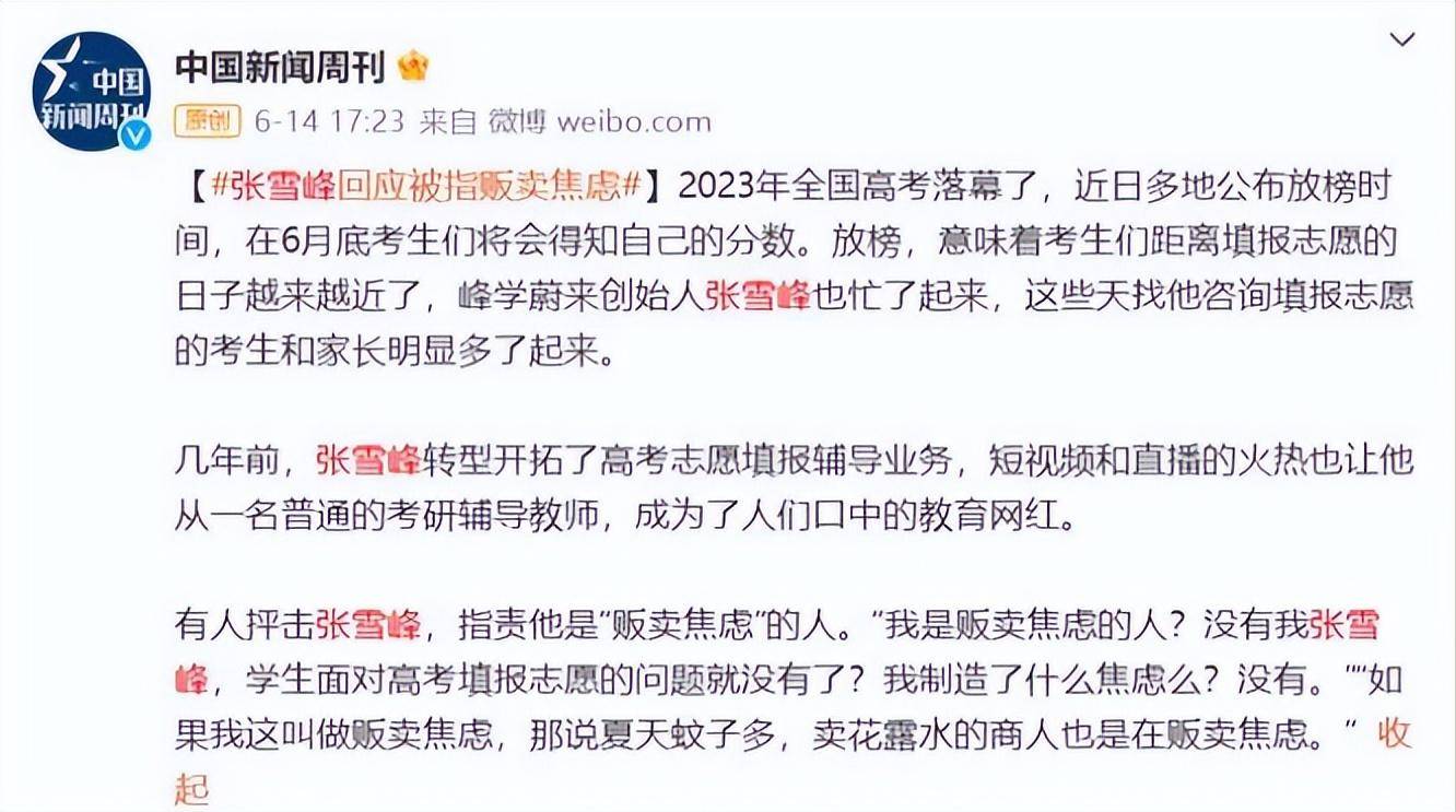 在高考结束后,张雪峰接受了中国新闻周刊的采访,回应被指责贩卖焦虑。