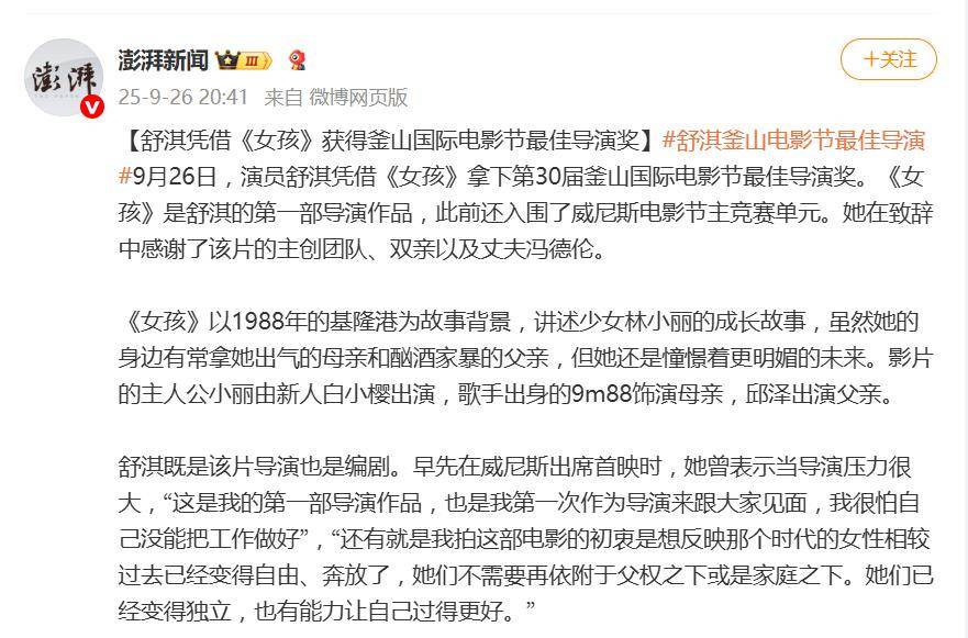 舒淇自编自导的处女作《女孩》在釜山国际电影节上大放异彩,不仅让她捧回最佳导演奖的奖杯,更以一句“谢谢我的先生冯德伦,谢谢他娶了一个不常回家的女人”的获奖感言,瞬间引爆网络。这部半自传电影,俨然成为她个人艺术生涯与情感生活交织的独特注脚。