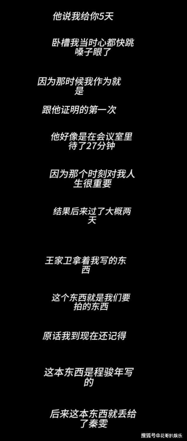 这个说法除了有和王家卫的聊天记录佐证,还有录音。也就是古二、王家卫、秦雯、许四一的聊天记录,在这个聊天局里,古二还在给他们仨做饭。从这场聊天里,我们能得到不少有效信息,王家卫确实看不上秦雯和许四一的创作。他直接说秦雯的创作点太low了,只会写情情爱爱,不会写故事。