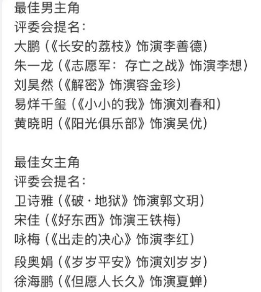 名单公布后,很多人都说爆冷,但其实即便没有特别重量级的男女演员入围,但男演员的竞争也算激烈,大鹏、易烊千玺、朱一龙、刘昊然和黄晓明都有实力名气和胜算。但最佳女主角的提名,除了宋佳和咏梅比较有名有实力,其余几位确实有点意外。