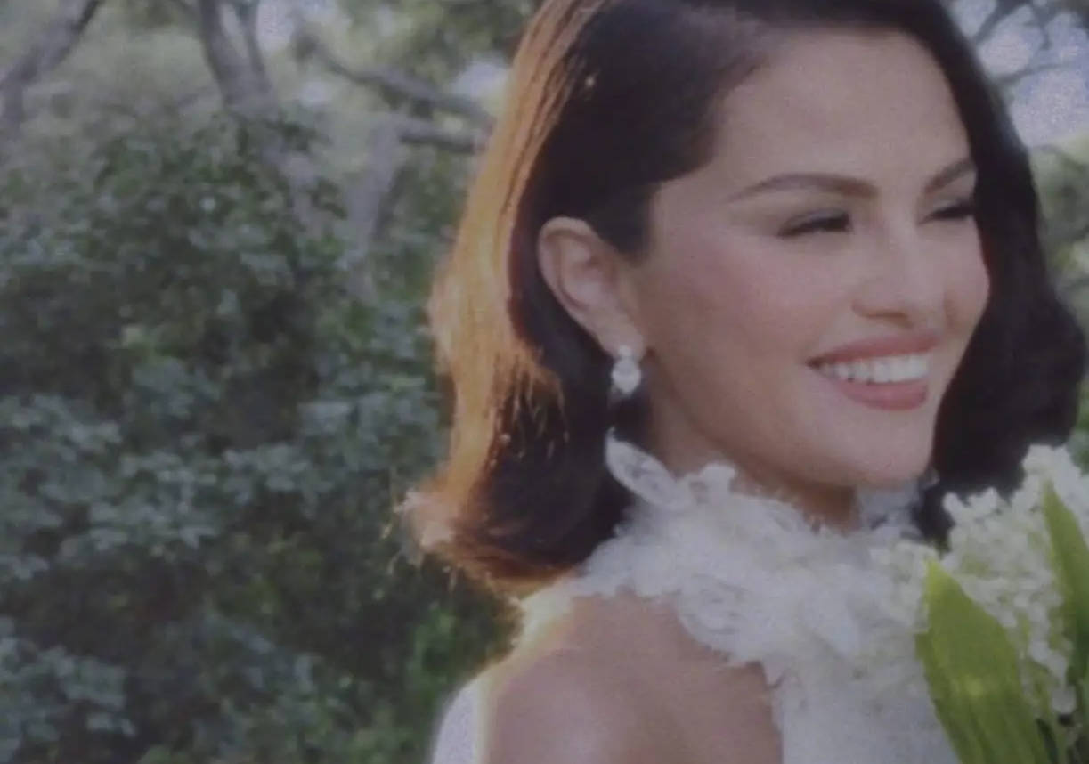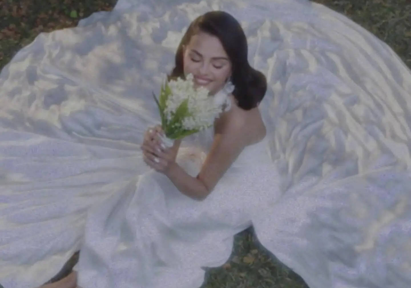 赛琳娜手拿捧花,闭眼甜笑。