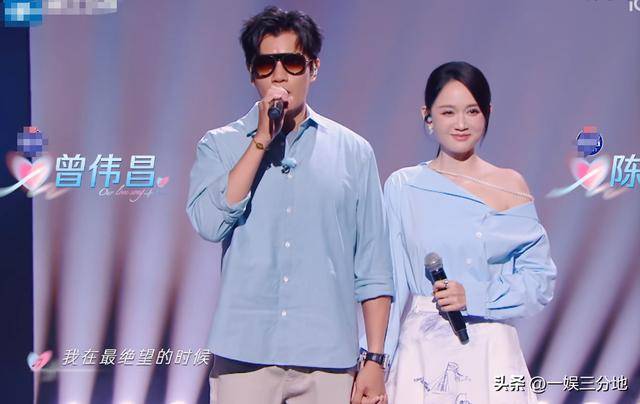 同样有着素人伴侣的陈乔恩,则是拉着眼睛受伤、不得不戴着墨镜的曾伟昌,来到了舞台中央。