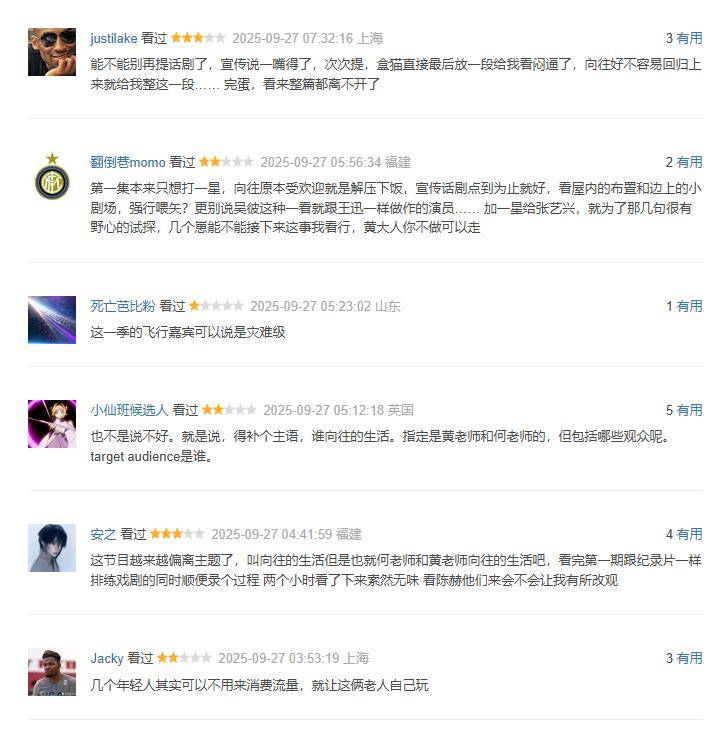 豆瓣平台涌现的观众意见呈现惊人一致性,几乎形成清一色的负面评价浪潮。与往季好坏参半的常态不同,本季首期罕见地出现了差评扎堆、好评难觅的局面。大量观众不约而同地提到同一个观感——难以忍受的无聊。讨论区甚至出现专门统计1"弃剧时间点1"的帖子,有人开场即退出,更多人坚持到话剧排练环节后选择离开。