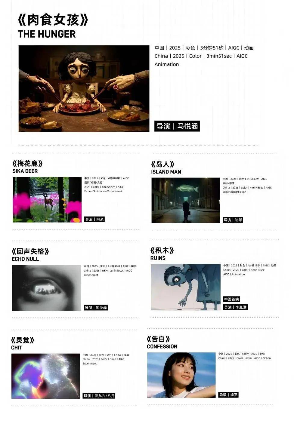 在本次UNTITLED未命名单元中,七部“超级创作者”的作品成功入围。它们不仅是技术的呈现,更是一段段共同成长、持续探索的视觉见证。陆邖的《岛人》,在一次次技术尝试与迭代中,于数字浪潮中构筑一座孤岛,探讨人与科技的依存与疏离;山音的《积木》全片使用拍我AI全新的V5模型,以流动的视觉语言走进阿尔茨海默病的情感世界;阿米的《梅花鹿》则通过结合黑色幽默与AI,探讨了人与自然、人与自我之间的关系。阿亮的《告白》以AI精准复刻真人实拍的细腻质感,在文艺叙事中捕捉人际相遇的短暂与无常。