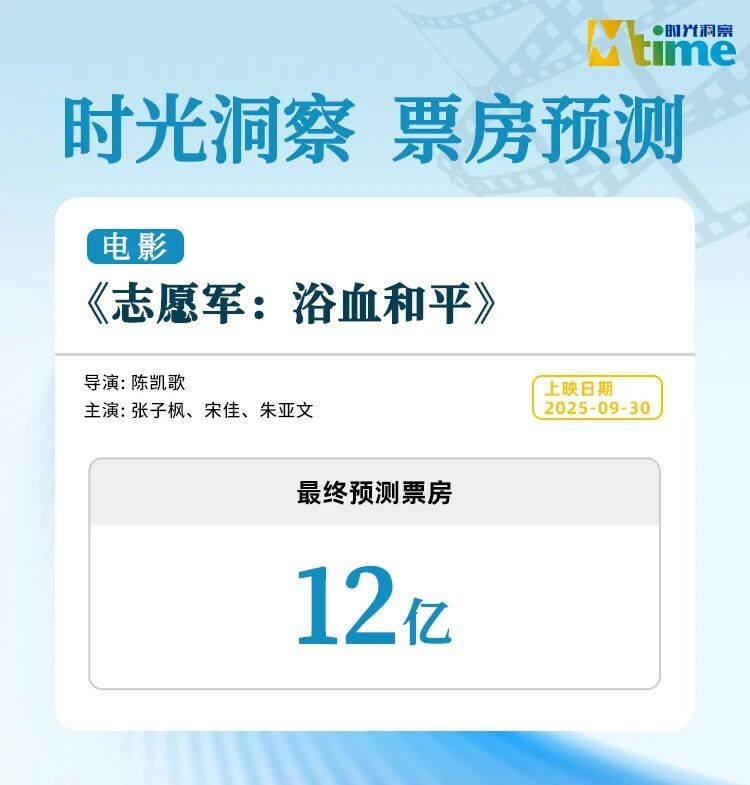 时光洞察预测《志愿军:浴血和平》或将成为档期票房冠军,《浪浪人生》《刺杀小说家2》同样是国庆档强有力的竞争选手,10月4日檀健次主演的《震耳欲聋》是国庆档的最大变数,如果口碑过硬,或将成为档期后半程的票房黑马。