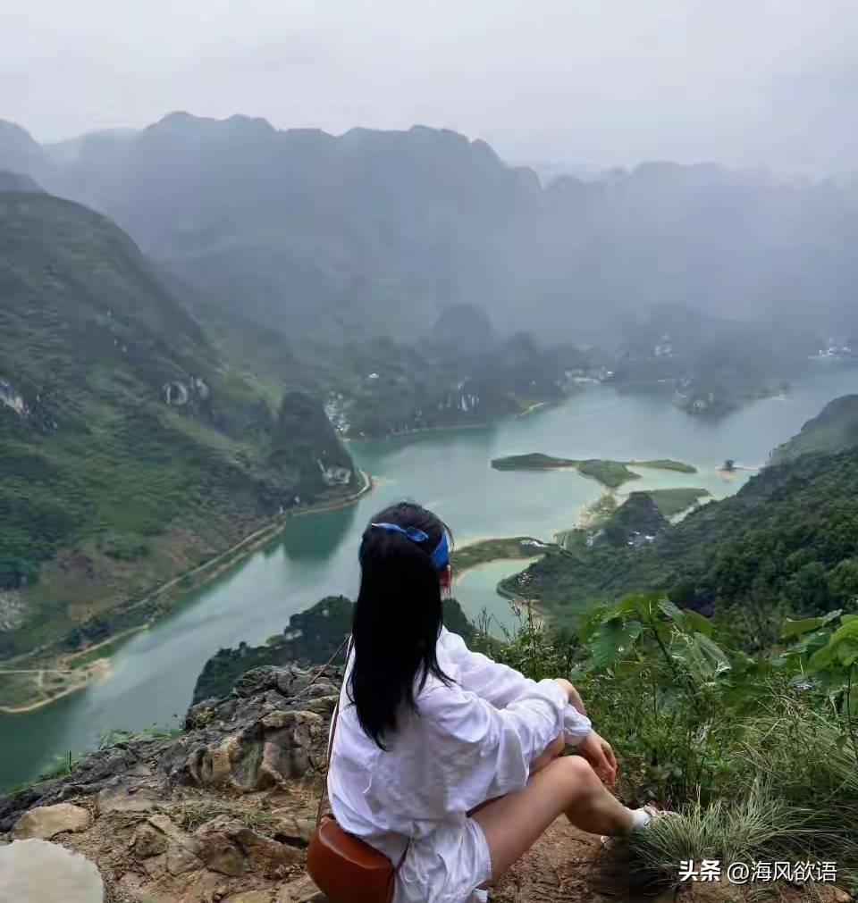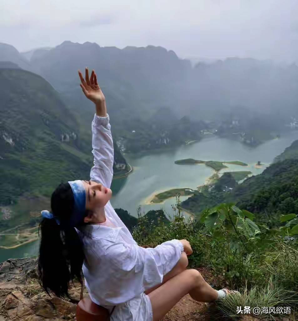 这次重游也是说到做到,哪怕雨天山路滑,她还是翻山越岭登顶了,发文说“云雾把湖藏了起来,但依然很美”。