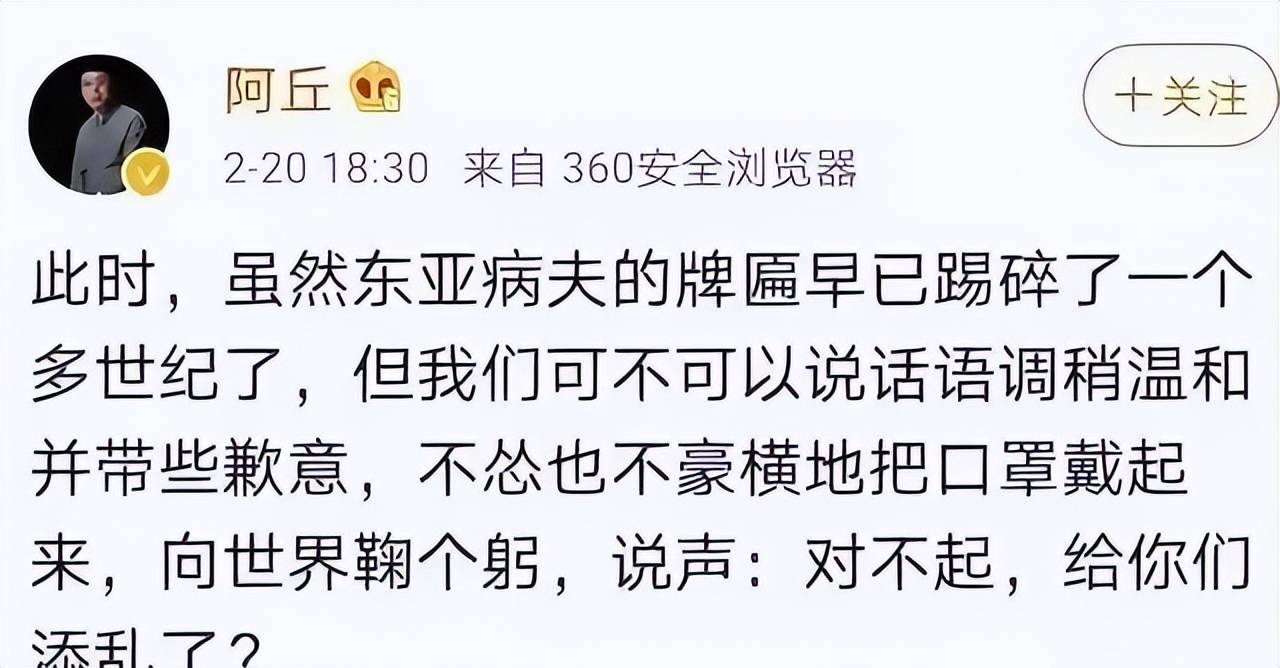 然而,阿丘却在这个时间点,冷不丁地发了一篇微博:“中国应该语调温和,鞠躬向世界道歉!”还意有所指地点出“东亚病夫”这个词。