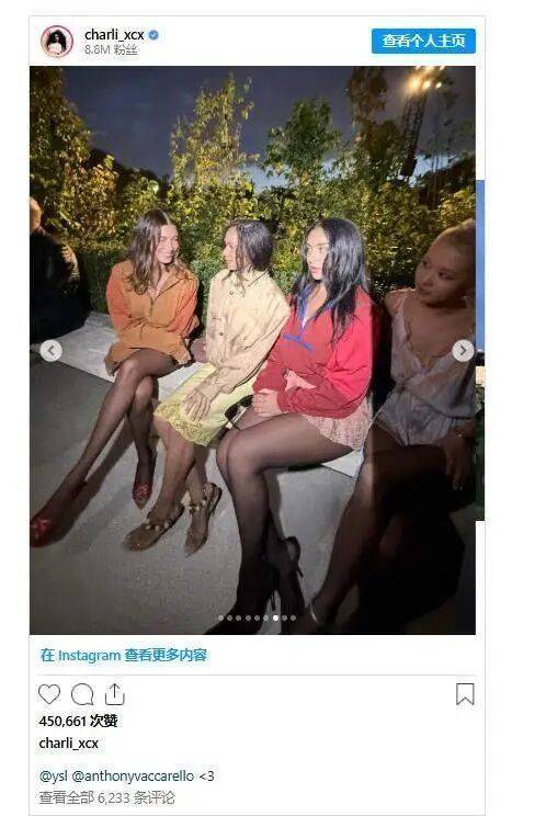 事情发生在9月29日的圣罗兰大秀现场。Rosé以一身品牌造型亮相,本就因风格两极引发热议,没想到场外“冷遇”戏码更抓马:Charli XCX在Instagram发布的秀场座位照中,坐在她身旁的Rosé几乎成了“背景板”——面容模糊、光线昏暗,和Charli本人精心调整的镜头感对比鲜明。