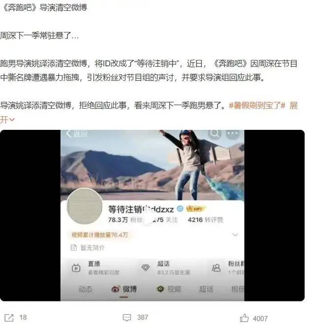 第九季节目播出的时候,“跑男导演姚译添”话题突然登上热搜,原来在录制节目的时候,周深遭遇暴露拖拽,这样的情况出现,周深的粉丝希望导演组做出回应,出现这样的事情后,很多网友都认为,周深大概率不会录制下一季节目。