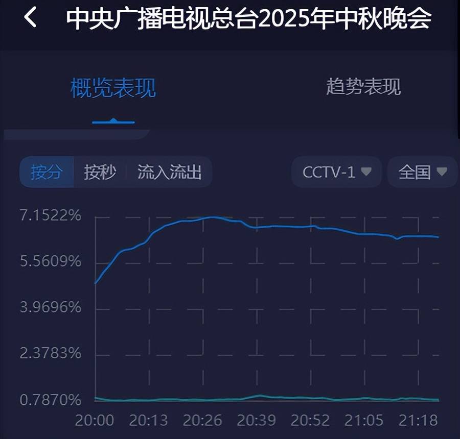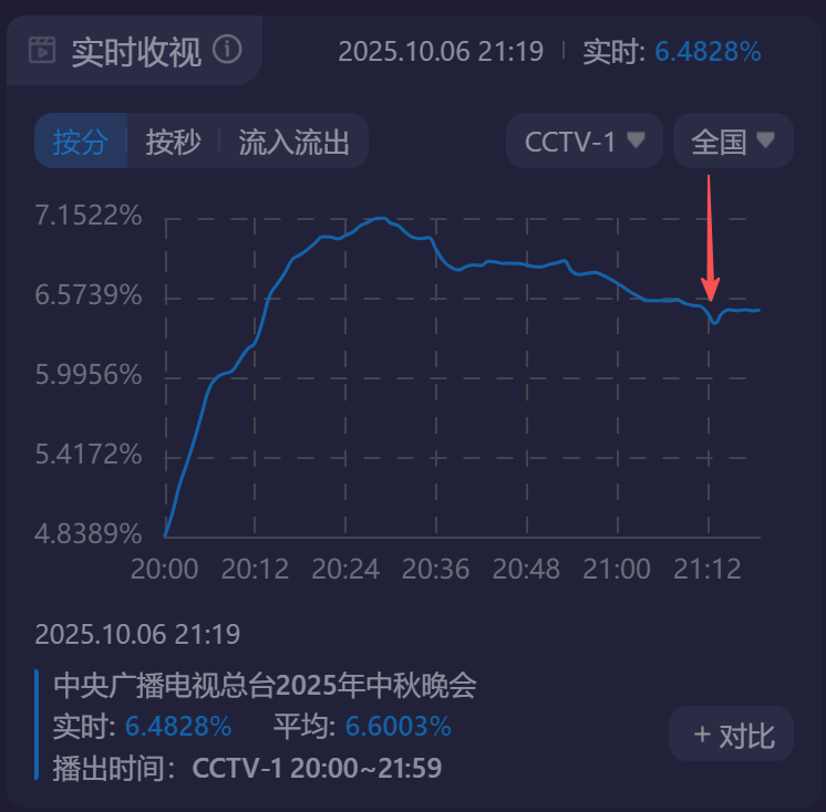 对比去年央视中秋晚会的收视率,收视率明显有大幅提升。去年央视中秋晚会的最高峰值5.9,平均收视率5.6,而今年平均峰值是6.5,最高点破7。