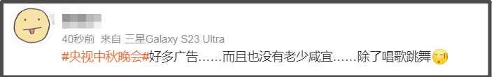 还有广告的问题,今年秋晚的广告太多,完全影响了观众的观看体验,不仅有中插植入短片、主持人播报广告,还被镶嵌在舞美上,比如灯笼、小桥、阁楼等等,而且每个广告的长度快赶上一个节目的长度,让人难以忍受。