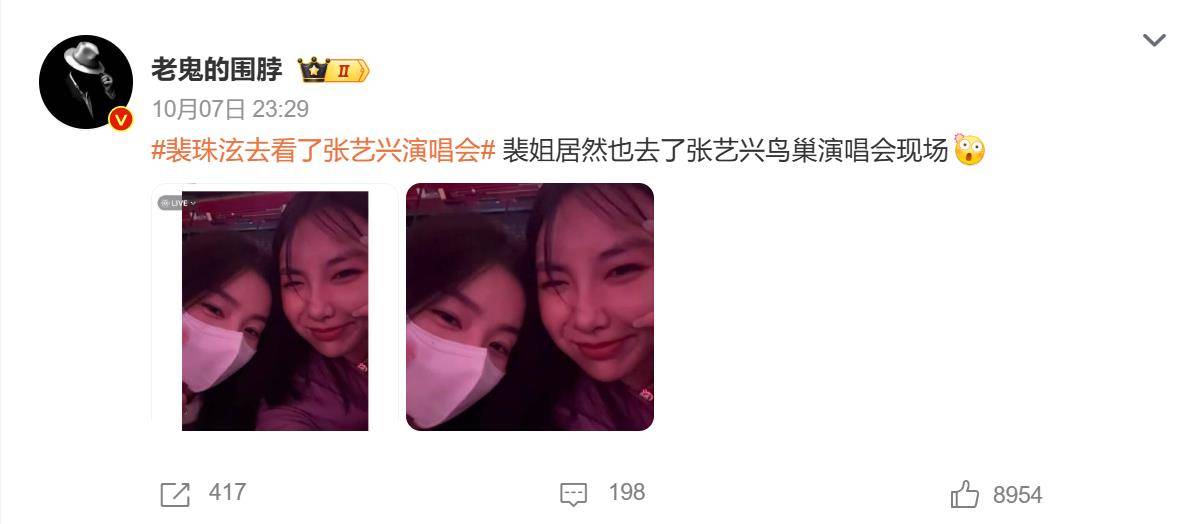10月7日,一则“裴珠泫现身鸟巢看张艺兴演唱会”的消息突然刷屏社交网络。这位韩国顶流女团成员被曝于中秋假期低调赴京,以一身黑色上衣、鸭舌帽加口罩的“路人装备”沉浸式观看了张艺兴的「大航海5·闹天宫」演出,全程零互动、零曝光,被网友调侃为“顶级爱豆的私人追星现场”。