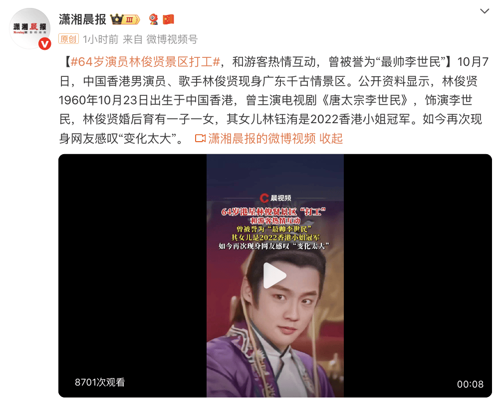 10月7日,中国香港男演员、歌手林俊贤现身广东千古情景区。公开资料显示,林俊贤1960年10月23日出生于中国香港,曾主演电视剧《唐太宗李世民》,饰演李世民,林俊贤婚后育有一子一女,其女儿林钰洧是2022香港小姐冠军。如今再次现身网友感叹“变化太大”。