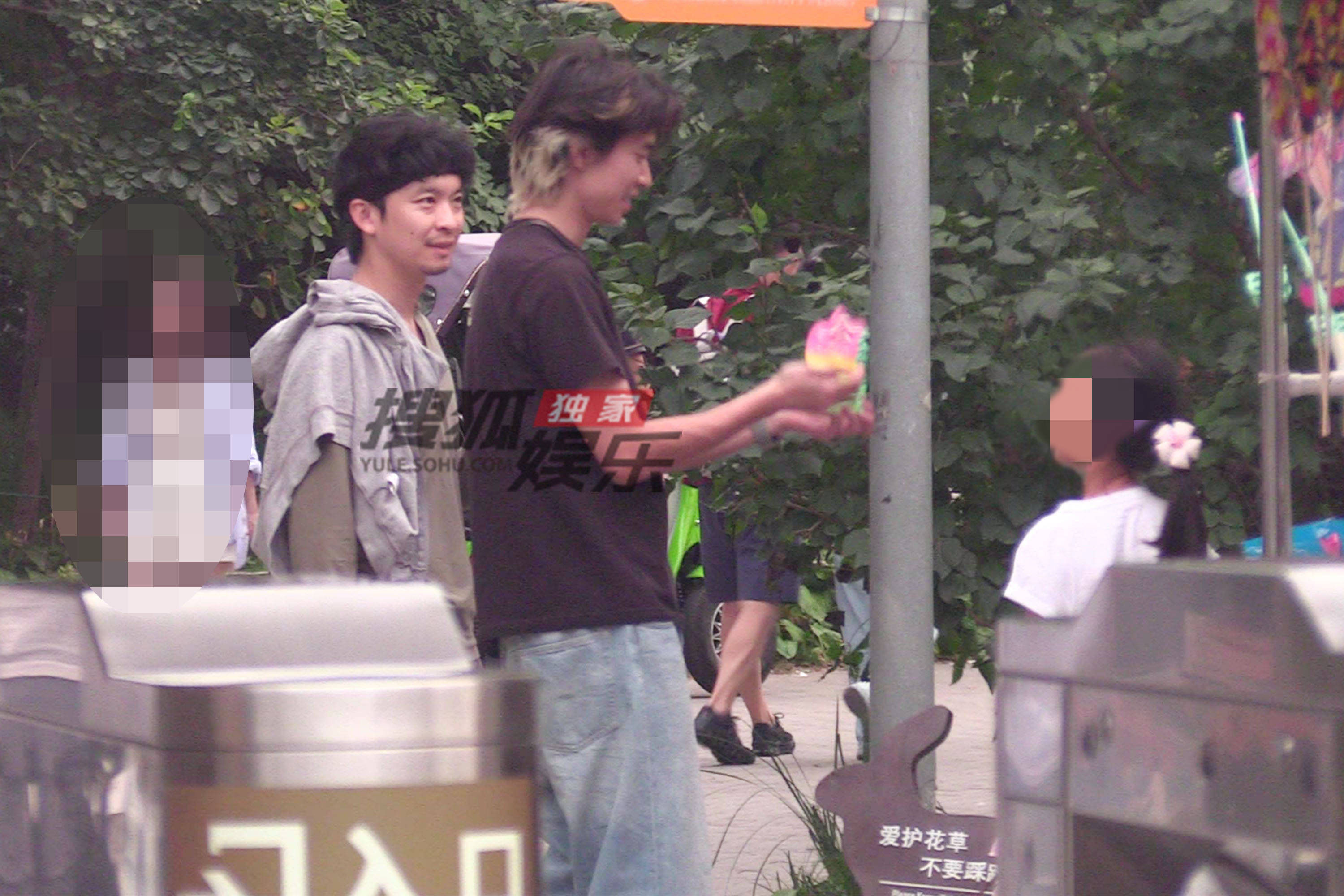 当天董子健穿着皱皱巴巴的T恤,头发没有打理,戴着发带,整个注意力都在孩子身上。