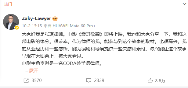 我这里为什么要用所谓的呢?因为即便是片方嚷嚷出来的原型律师,都遭遇了质疑。10月7日的时候,一位名为“手语律师唐帅”的律师,站出来,通过自己的媒体账号发布视频内容维权。在他的维权内容当中,明确告知网友,这部电影的制片方最早是找他合作的,依据他的原型来创作的,后来,两方合作当中出现分歧,唐帅律师向片方支付了高昂的违约金,解除了合作。