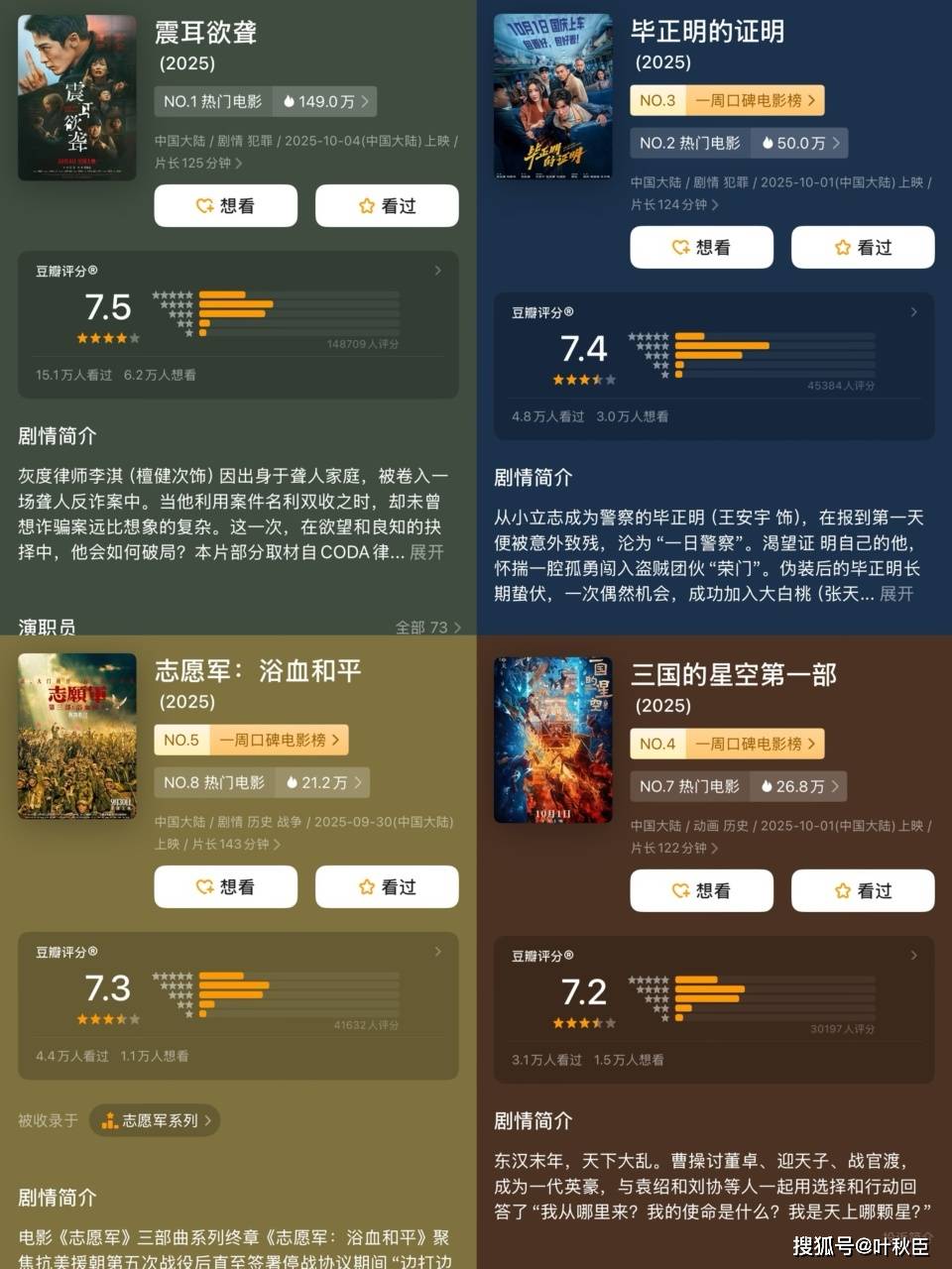 以豆瓣平台为参考,目前口碑最佳的是《震耳欲聋》(7.5分),接着是按照等差数列公差d=-0.1的规律——《毕正明的证明》(7.4分)和《志愿军:浴血和平》(7.3分),然后是《三国的星空第一部》(7.2分)。