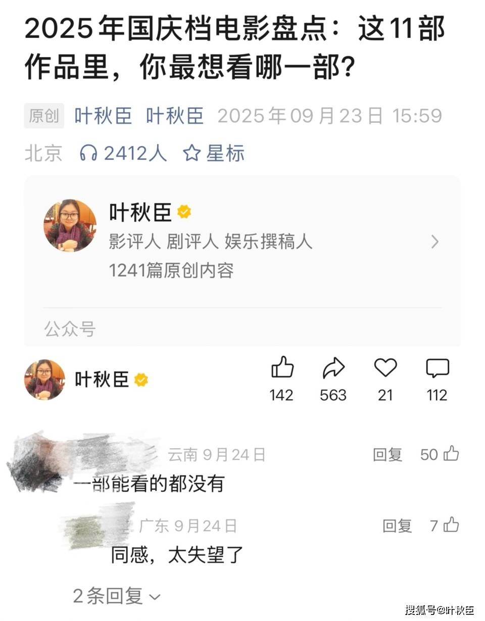 也许是因为叶秋臣此前写过一篇《2025年国庆档电影盘点:这11部作品里,你最想看哪一部?》的文章做了摸底,评论区里点赞量最高的评论就是“一部能看的都没有”,所以我对这个最终结果并不意外。