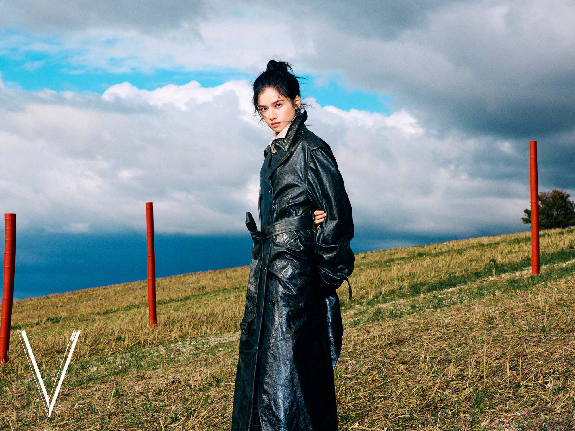张婧仪穿黑色皮风衣,眼神坚定。