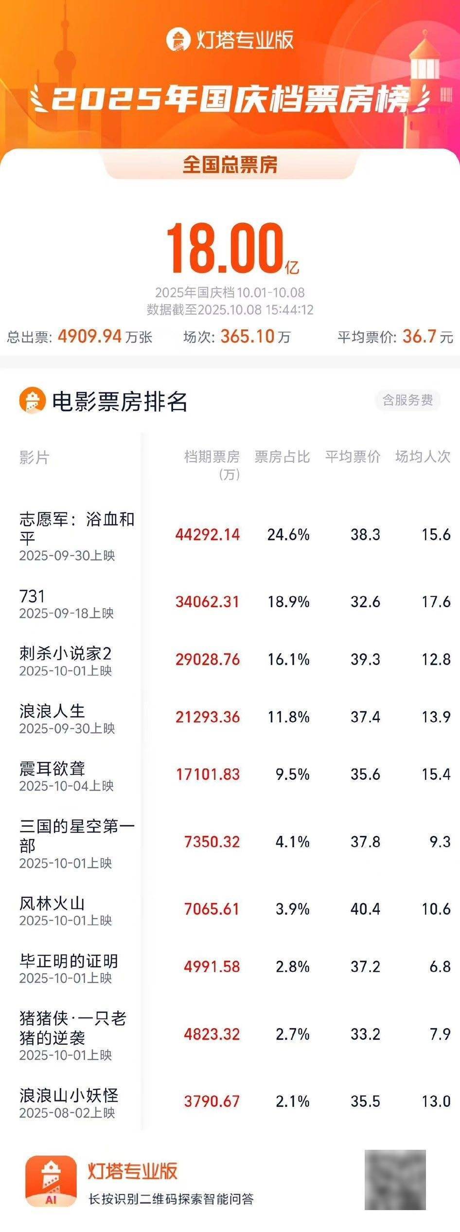 10月8日,为期8天的2025国庆档落下帷幕。据灯塔专业版数据,截至10月8日15时44分,2025年国庆档总票房突破18亿元,《志愿军:浴血和平》《731》《刺杀小说家2》《浪浪人生》《震耳欲聋》暂列票房前五。