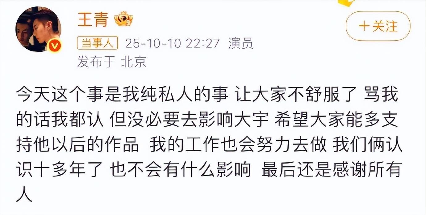 王青与冯建宇因2015年网剧《逆袭》组CP,曾约定2025年12月26日为“十年之约”节点。王青与王鹤润恋情曝光后,两人的CP粉指责王青“用CP红利养嫂子”,尤其2025年音乐节上二人拥抱互动被质疑“有女友仍卖腐”。