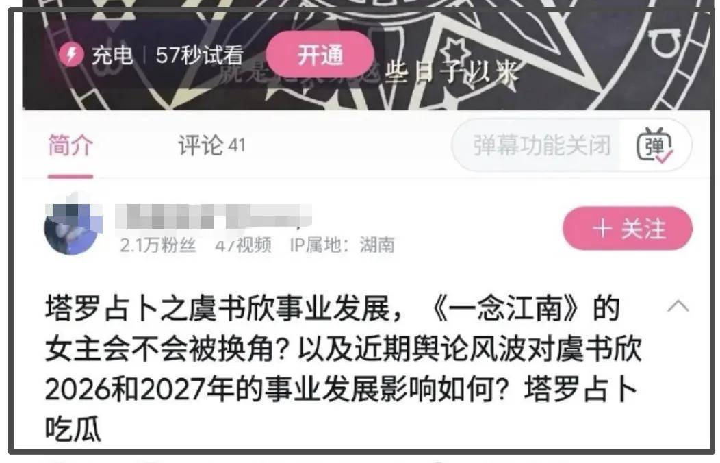 据悉,该up主用塔罗牌分析了一下虞书欣的事业发展,具体涉及到《一念江南》会不会被换角色,近期舆论对虞书欣2026年和2027年的事业发展到底有没有影响。要知道塔罗牌这种东西其实就是图一乐呵,娱乐消遣为主,但是没想到虞书欣竟然真的信这个,还特意充钱解锁充电视频。