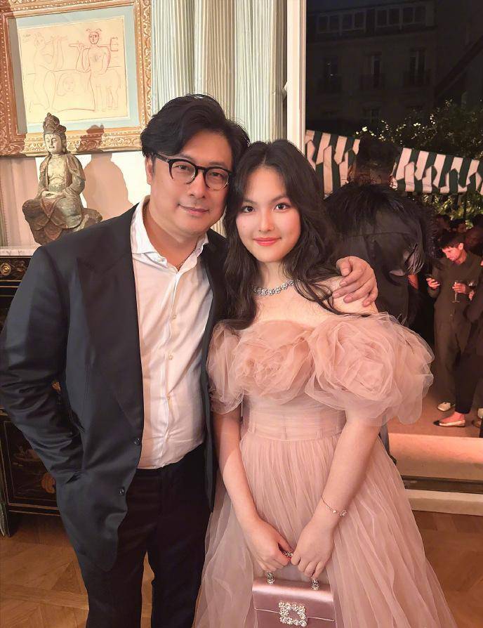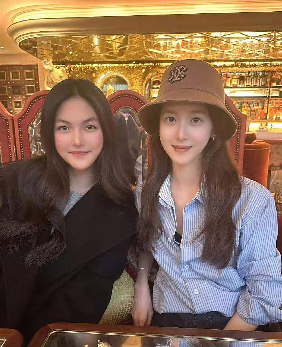 一向喜欢鲜艳颜色的李湘,挑选了一件印花浅色礼裙,和手中的鲜花正好匹配,母女俩都留着披肩长发,更像是一对姐妹花,气质、身材都很相似。