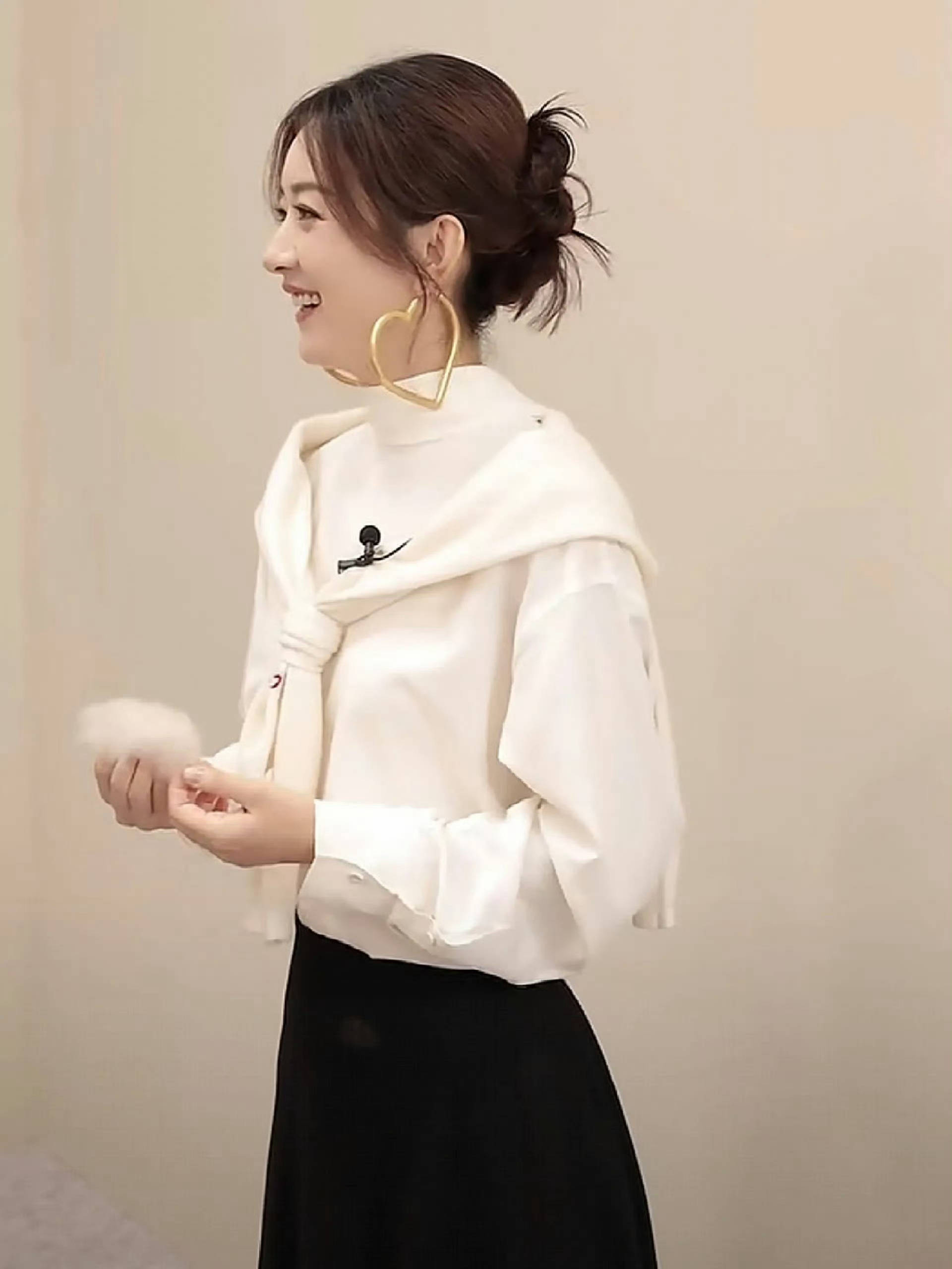 搜狐娱乐讯 近日,赵丽颖的一组活动造型曝出。图中,她穿着白色衬衫,搭配爱心大圈耳环,坐姿优雅。